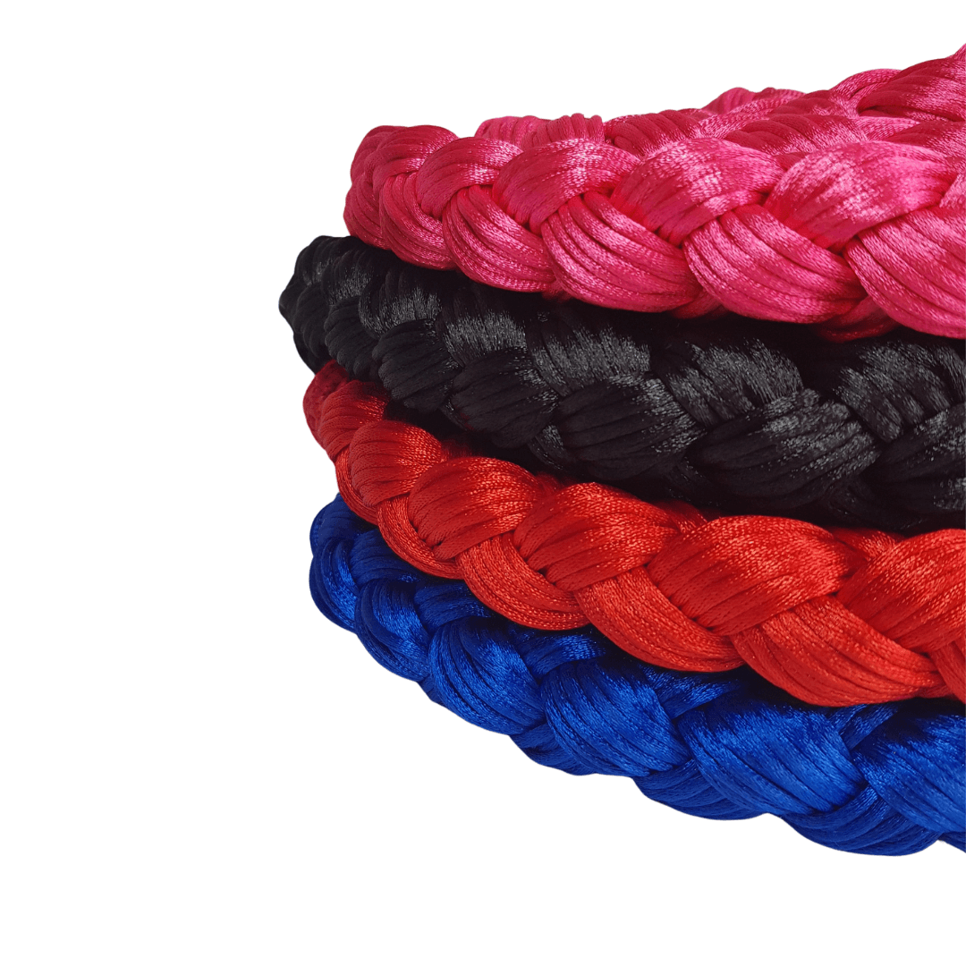 TRENZADA ARTESANALMENTE CON MATERIALES RESISTENTES Y DURADEROS. MOSQUETON DE BRONCE.